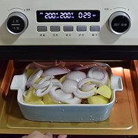 做法分解5:洋葱铺入烤盘,放入鸡胸肉,再填满土豆。