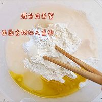 做法分解1:把白色面团所有食材加入碗中用筷子搅拌成面絮状,直接揉成面团。