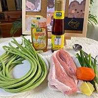 长缸豆9根,猪肉100克,姜少许,葱2根,胡萝卜一段,太太乐鸡汁3勺,太太乐芝麻香油2勺,五香粉少许,蚝油1勺,生抽1勺,淀粉1勺,食用油1勺,料酒1勺,水适量