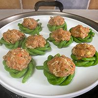 做法分解13:搅拌好的肉糜放入豇豆花环上