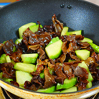 做法分解4:锅内再加油烧热,放木耳大火翻炒3分钟,先把木耳炒熟炒软,再放入佛手瓜,快速翻炒,将佛手瓜炒至7成熟左右。