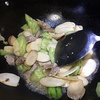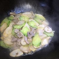 做法分解6:倒入杏鲍菇和青瓜片翻炒均匀,加入酱油和少量水煮开
