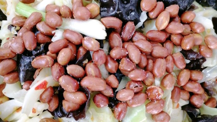 做法分解7:这是弄好的凉拌菜,爆炒到一定程度就把木耳倒下去翻炒一会再倒包菜下去搅拌均匀,包菜撒下去时就要关火哦!装盘后在上面撒上花生米就ok啦!