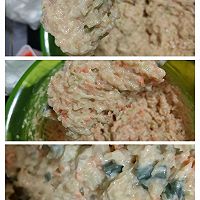 做法分解5:加淀粉搅匀在加胡萝卜搅匀,最后加皮蛋在搅。搅拌一直都朝一个方向。干湿程度像图片这样就行了
