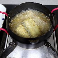 做法分解5:将裹着淀粉的带鱼段放入油锅中,先不要翻动,待鱼段被炸到微黄后,轻轻翻动,捞出控油;每次不要放太多,6块左右就可以了,留出翻动的充足空间;