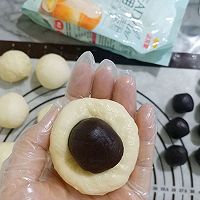 做法分解11:取一个醒发好的面团,将豆沙馅儿包裹进去,将收口收紧,收口如果没有收紧的话,在后面烤的过程中会爆馅儿