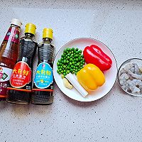 大米150克,虾仁100克,红椒50克,黄椒50克,青豆50克,葱10克,姜10克,料酒15克,蒸鱼酱油15克,盐适量,红烧酱油15克
