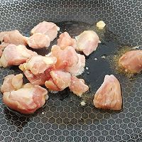 做法分解2:锅烧热加油晃晃匀,铺上提前收拾干净切小块的带皮鸡腿肉或者别地儿的带皮肉,带不带骨看心情