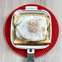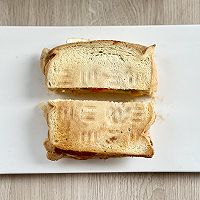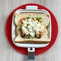 做法分解10:再盖上另一片吐司片,然后扣好三明治烤盘,分离式的烤盘,厚薄可以随心切换,即使夹了这么多的食材,还是可以轻松得扣上。