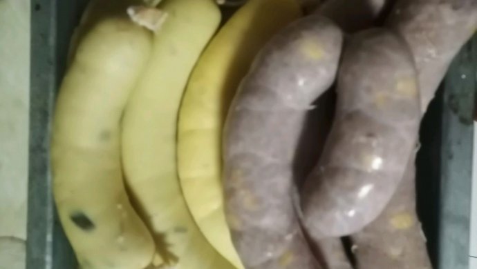 做法分解5:找个漏斗,没有漏斗可以找一个矿泉水瓶,去除掉底部,当作漏斗,将蛋液灌入肠衣分段封口。一定要留很长一段空隙25cm左右,因为煮肠、蒸肠会膨胀爆开。