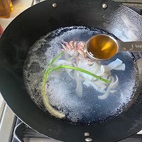 做法分解4:锅里烧水,水开下鱿鱼,加料酒