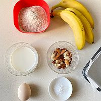 全麦面粉180克,鸡蛋1个,脱脂牛奶90克,泡打粉5克,香蕉3根,坚果碎(腰果、杏仁、核桃仁都可)30克
