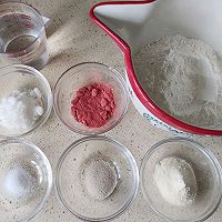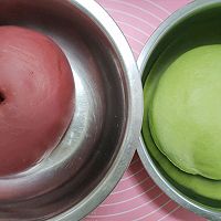 红色面团部分,水220ml,酵母4.5克,糖20克,面粉400克,草莓粉+红曲粉10克,奶粉12克,绿色面团部分,水220ml,酵母4.5克,糖20克,面粉400克,菠菜粉8克,奶粉12克,自制红豆沙馅儿适量,自制芋泥紫薯馅儿适量