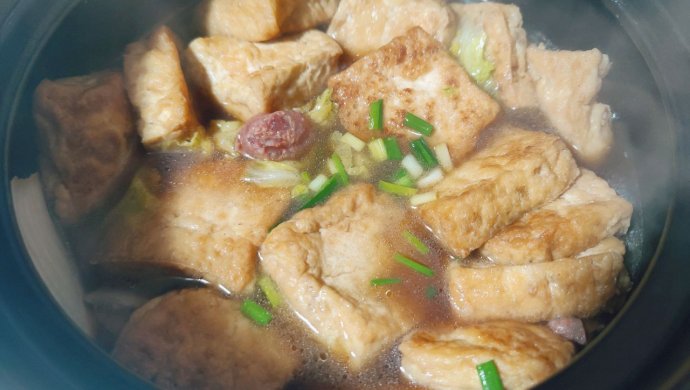 老豆腐一块,娃娃菜一颗,腊肠两根,生抽适量,老抽适量,葱适量,水一大碗,油适量