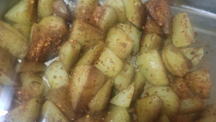 土豆3个,花椒粉1小勺,胡椒粉1小勺,菜籽油4小汤匙,辣椒面1小勺,生抽1小勺