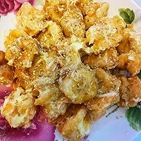 虾仁500克,芥末酱少许,沙拉酱适量,熟芝麻少许,蜂蜜芥末酱少许,蛋黄1个,玉米淀粉少许