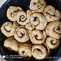 做法分解3:把材料全放进面包机和面,我一般和两次,然后发酵至充满面包机。如果没有面包机也可以自己和,发酵至两倍大,再次和面,拉伸成图片上的样子,内部放提子卷起来,中间切开,放模具内!