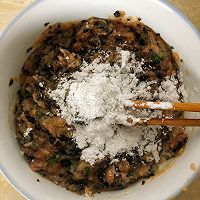 做法分解6:加入蚝油,盐,鸡精,胡椒粉,十三香,放适量干淀粉,顺时针方向使劲搅拌,让肉馅上劲。