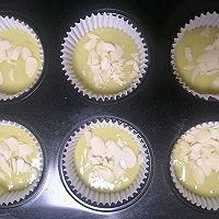 做法分解4:把面糊倒入纸模中,撒上适量杏仁片;预热烤箱,上下火180度烤25分钟;