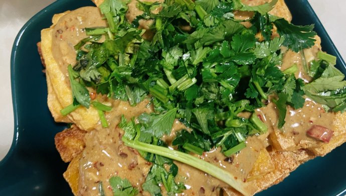 老豆腐一块,王致和臭豆腐乳3块,小米辣3个,葱花,蒜末,香菜适量,盐两小勺,糖一小勺,五香粉1勺,辣椒油适量,凉白开适量,芝麻酱适量