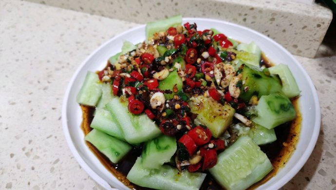 黄瓜2根,大蒜三瓣,小红椒5个,生抽三勺,陈醋1勺,葱2根,胡辣椒面1勺