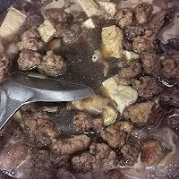做法分解5:倒入准备好的配菜,放入两汤勺生抽,一汤勺鸡精,一汤勺耗油,半汤勺十三香翻炒均匀。倒入两碗开水,小火炖五分钟配菜熟了。