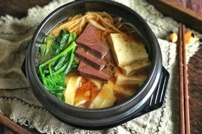 做法分解3:自己喜欢吃的配菜适量。我准备的是一块皮渣,一片油豆腐,和牛肉丸子。