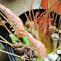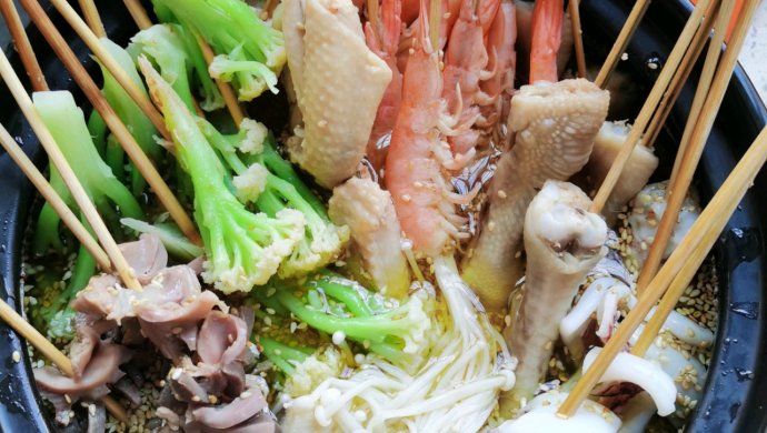 做法分解2:用竹签把各种食材串起来,也可以不串直接丢汤汁里泡