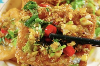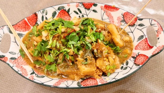 臭豆腐适量,食用油适量,生抽,耗油,麻酱适量,豆腐,芝麻,香菜,蒜末,葱末,糖,胡椒,孜然,辣椒面