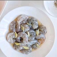 做法分解2:将海虾去虾头虾线,加入黑胡椒,盐,柠檬汁,生姜片,抓拌均匀,腌制10分钟去除腥味。