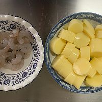 做法分解1:玉子豆腐切成1.5cm厚的段,虾仁处理干净用料酒和白胡椒腌制。