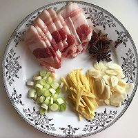 做法分解4:肥点的五花肉切片、大葱葱花、姜丝、蒜片、花椒大料各少许备用。