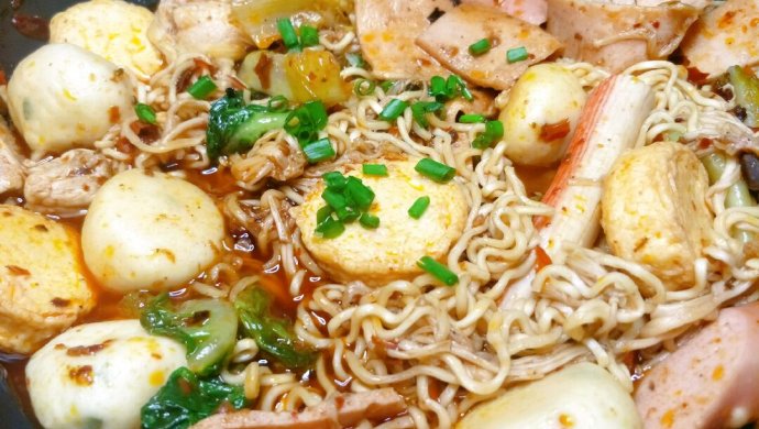 丸子,蔬菜,泡面1包,海底捞麻辣底料1包,葱1根,蒜末1茶匙