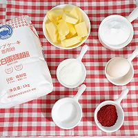 黄油90g,糖粉50g,食用盐2g,鸡蛋1个,奶粉10g,蛋糕粉170g,红曲粉3g