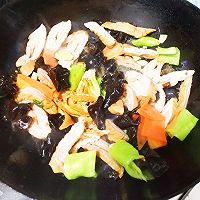 做法分解4:食材放齐了翻炒几下,放入调料,再继续翻炒。快出锅时把调好的淀粉汁放入锅中再翻炒几下就可出锅啦。