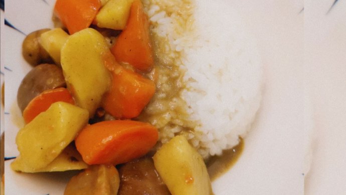 小胡萝卜两根,咖喱块1块,山药半根,板栗8—9颗,香肠1根,牛奶小半碗,酱油半勺,水三小碗