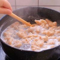 做法分解13:.水开以后,把肉泥一下下刮下去,如果感觉刮不动了,勺子水里烫一下,就可以很顺滑。