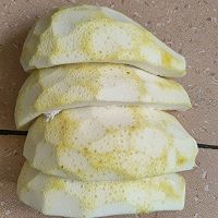 做法分解2:取出果肉,皮一分为四,用锋利一点儿的刀削去最外面那层黄色的壳