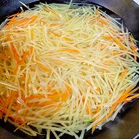 做法分解4:锅内烧水,水开放入土豆丝胡萝卜丝焯水一分钟。