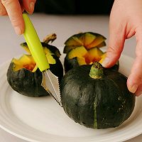 做法分解1:首先我们把南瓜洗干净用这种刀凹个造型,如果没有工具也可以直接把盖子切掉。