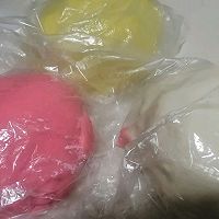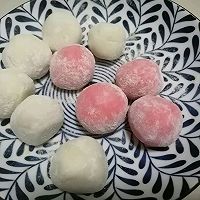 做法分解7:粉色面团下剂子20克包入馅心(我这个包的是花生馅料),用虎口收口法包裹严实,在手中团圆了放在碗里沾上糯米粉,防止黏连。