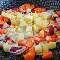 做法分解5:盖上盖子把土豆咕嘟软,块小用不了十分钟,开盖铺上把肥牛