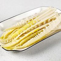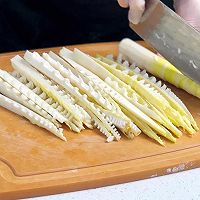 做法分解5:鹅妈妈钛晶锅烧开水,撒入适量食盐,放入笋条煮5分钟左右(这样做的目的是去除过量的草酸和涩味);