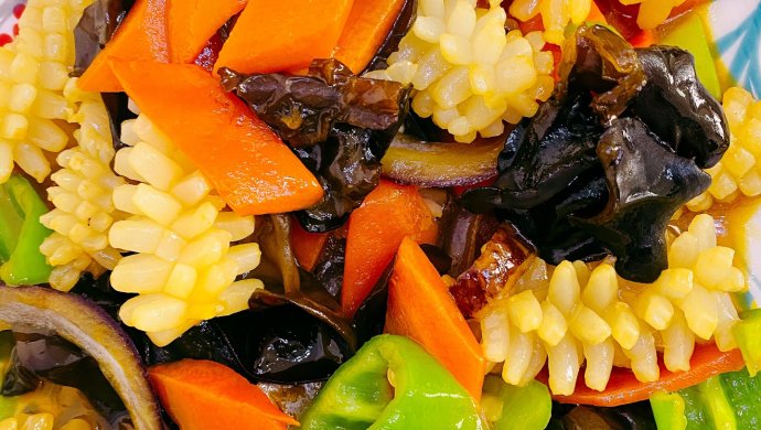 胡萝卜半个,木耳适量,鱿鱼250克,青椒半个,蒜1瓣,洋葱适量,生抽2汤匙,油适量,葱2根,盐适量,老抽适量