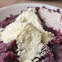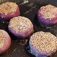 紫薯500g,糯米粉适量,奶粉适量,糖适量,奶酪碎适量,熟白芝麻适量,油适量