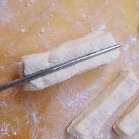 做法分解8:再叠加一条面,用筷子中间压一下,就做好一个油条了!两条为一组!