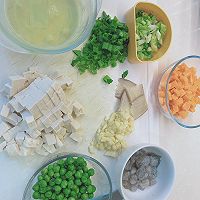 豆腐1块,胡萝卜1根,豌豆适量,虾仁适量,蒜4-5瓣,葱、芹菜、姜适量,水淀粉适量,蛋白2个,盐适量,白胡椒粉适量,糖适量,蘑菇精适量,蒜酥少许