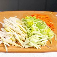 做法分解3:笋切丝、胡萝卜切丝、芹菜切小段(这里的配菜可以选择自家孩子喜欢的种类);