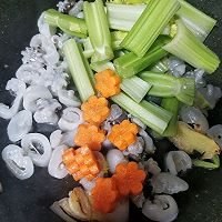 做法分解6:放入墨鱼,发白后加入西芹段,胡萝卜