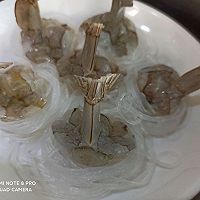 做法分解4:把前部穿过开缝处,形成虾球,放到粉丝上,入锅蒸,最好盖一个高点的盆,盖住盘子,避免蒸汽落入盘中